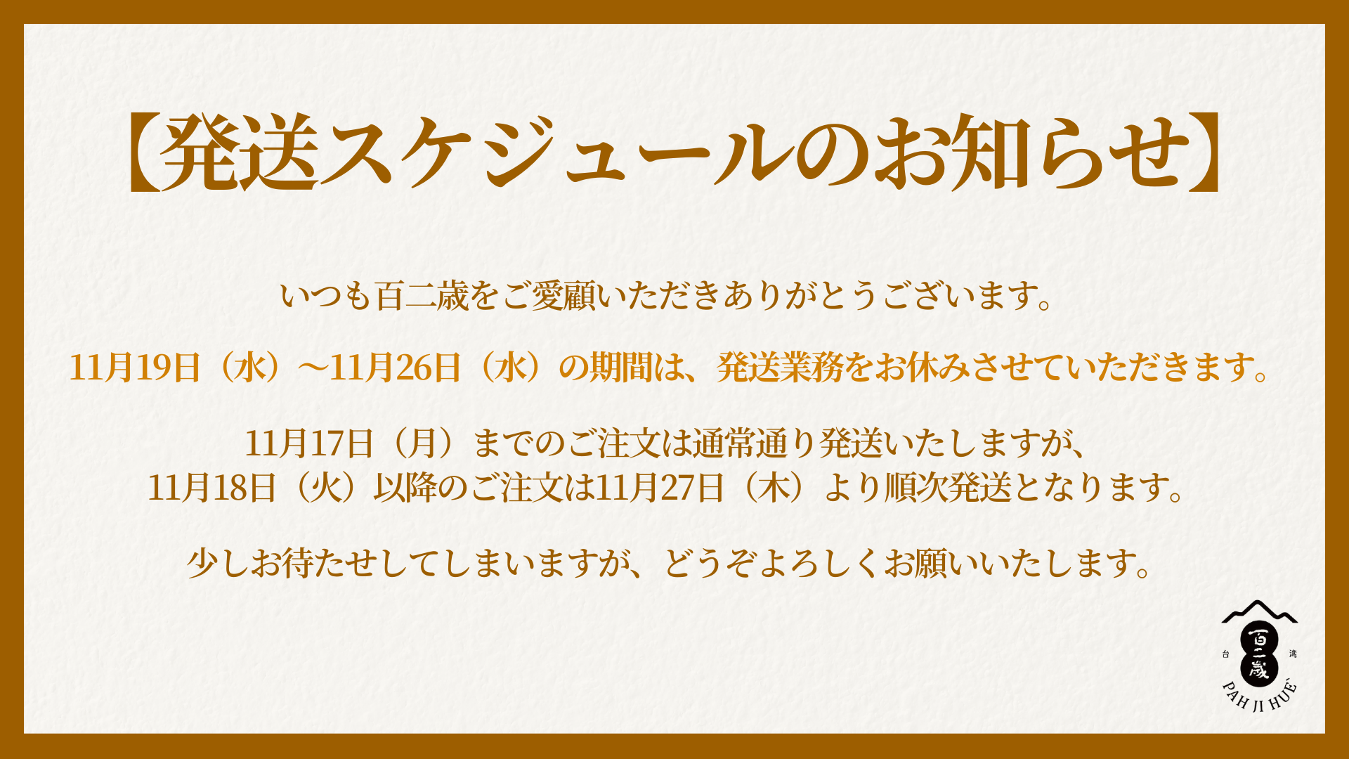 【発送スケジュールのお知らせ】 いつも百二歳をご愛顧いただきありがとうございます。11月19日(水)~11月26日(水)の期間は、発送業務をお休みさせていただきます。11月17日(月)までのご注文は通常通り発送しますが、11月18日(火)以降のご注文は11月27日(木)より順次発送となります。少しお待たせしてしまいますが、どうぞよろしくお願いいたします。